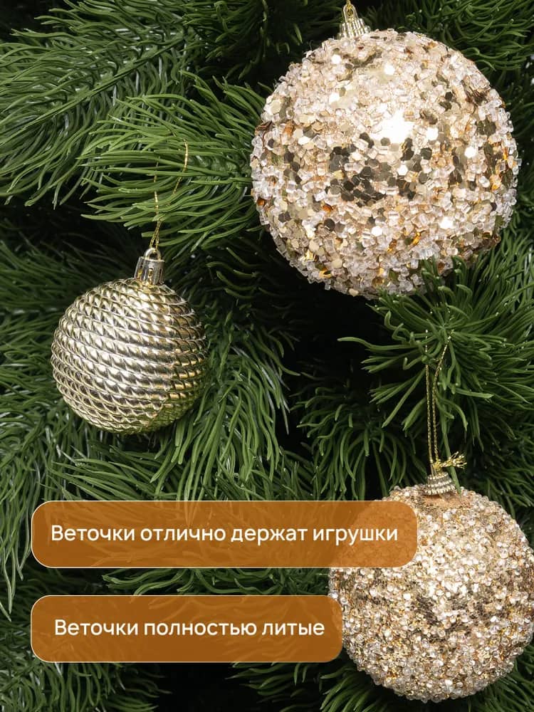 Ветки нашей искусственной сосны выглядят настолько натурально, что их трудно отличить от настоящих! Они созданы для того, чтобы стать идеальным холстом для ваших самых смелых новогодних фантазий. Легко разводятся в стороны, придавая ели невероятную пышность и объем, и равномерно заполняя пространство, создавая ощущение настоящего лесного чуда.